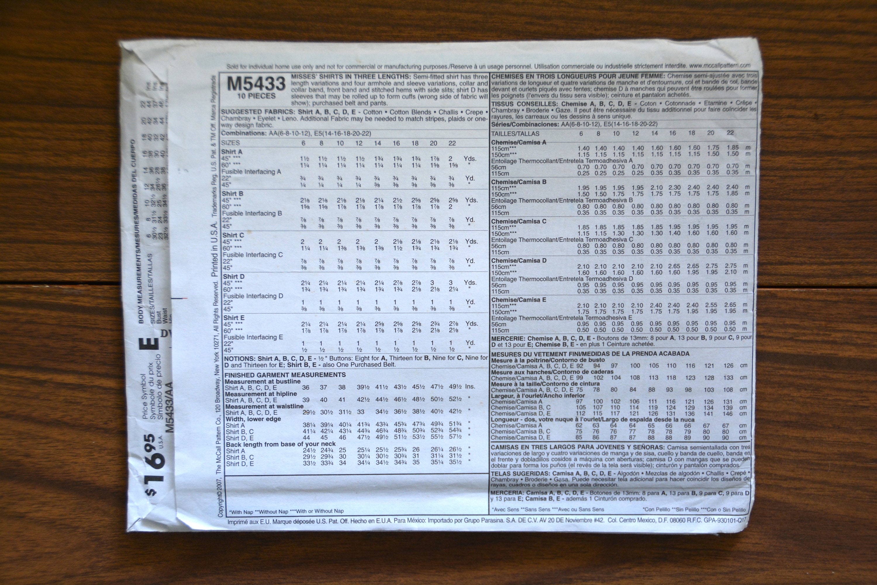 Mccall S Sewing Pattern M5433 Shirts In Three Lengths Size Etsy